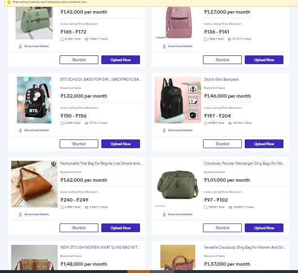 trending bags on Meesho," "best-selling bags on Meesho," and "popular bags for online selling."